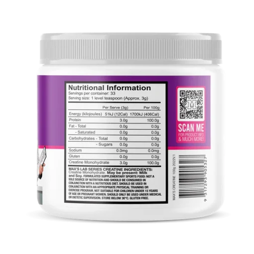 کراتین مونوهیدارت مکسس MAX’S CREATINE MONOHYDRATE از کراتین مونوهیدرات خالص میکرونیزه شده ساخته شده است که به طور گسترده مورد مطالعه قرار گرفته است. طبق بررسی های کراتین مونوهیدرات ایمن و موثر است. این شکل خالص کراتین به افزایش انرژی و قدرت برای دوره های شدید فعالیت بدنی کمک می کند و به افزایش عضلات بدون چربی کمک می کند.