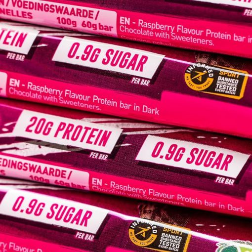 ترکیب پروتئین (کلسیم کازئینات (شیر)، پروتئین وی (شیر)، کنسانتره پروتئین وی هیدرولیز شده (شیر))، شکلات تلخ با شیرین کننده (20%) (کاکائو، شیرین کننده: مالتیتول، کره کاکائو، امولسیفایر) طعم دهنده طبیعی)، مرطوب کننده: گلیسرول. آب، پودر کاکائو، روغن پالم، فیبر غذایی: پلی دکستروز. شکلات سفید با شیرین کننده (شیرین کننده: مالتیتول، کره کاکائو، پودر شیر کامل، امولسیفایر: لسیتین ها (سویا)؛ طعم دهنده طبیعی)، چیپس کاکائو سویا (پروتئین سویا، پودر کاکائو، نشاسته تاپیوکا)، طعم دهنده طبیعی، پودر کم چرب، کنسانتره رزبری، مالتودکسترین، تنظیم کننده اسیدیته: اسید سیتریک؛ شیرین کننده: سوکرالوز؛ کنسانتره (هویج، توت سیاه). همچنین ممکن است حاوی غلات حاوی گلوتن، بادام زمینی و آجیل باشد.
