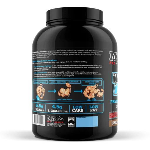 پروتئین وی ایزوله مکسس 1.82 کیلوگرم MAX’s WHEY ISOLATES یک مکمل پروتئینی با کیفیت بسیار بالا است که برای افرادی که هدفشان ساخت عضلات خشک و بدون چربی است ساخته شده است. این محصول حاوی پروتئین وی ایزوله و پپتیدهای هیدرولیز شده وی است که هردوی آنها از بهترین انواع پروتئین برای ساخت عضله محسوب میشوند.