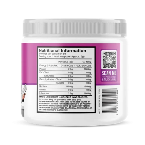 MAX’S L-Leucine حاوی تنها L-Leucine خالص است و هیچ افزودنی، پرکننده یا ماده binders ندارد. این به معنای یک محصول خالص و مؤثر است که میتوانید به کیفیت آن اعتماد کنید.