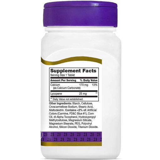 لیکوپن موجود در لیکوپن سنتری 25 میلی گرم 60 عدد 21st Century Lycopene یک نوع آنتیاکسیدان است که به گروه کاروتنوئیدها تعلق دارد. این ماده به طور طبیعی در برخی از میوهها و سبزیجات قرمز و نارنجی یافت میشود و به ویژه در گوجهفرنگی و محصولات گوجهفرنگی به میزان زیادی وجود دارد. لیکوپن به عنوان یک رنگدانه قرمز در گوجهفرنگی و دیگر محصولات گیاهی شناخته میشود و باعث رنگ قرمز این مواد غذایی میشود.