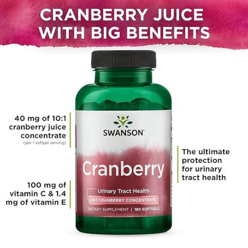 Swanson Cranberry یک مکمل غذایی مؤثر برای ارتقاء سلامت مجاری ادراری است که با کنسانتره آب کرن بری قدرتمند و فرم نرمژل راحت، به شما کمک میکند از خواص کرن بری بهرهبرداری کنید. با مصرف منظم و تحت نظر پزشک، میتوانید از فواید این مکمل برای حفظ سلامت مجاری ادراری و بهبود کیفیت زندگی خود بهرهبرداری کنید.