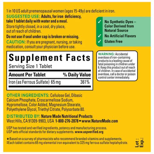 آهن 65 میلی گرم نیچرمید، 65 میلی گرم آهن (325 میلی گرم سولفات آهن) را با یک قرص روزانه فراهم می کند.