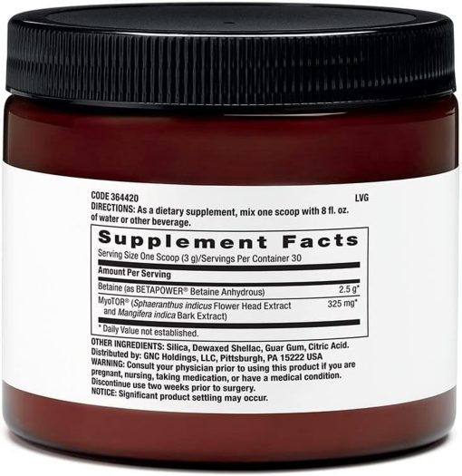 مكمل ريكاوری MyoTOR + Betain جی ان سی محصولی تخصصی از برند معتبر GNC Beyond Raw Chemistry Labs است که برای بهبود قدرت، استقامت و سرعت ریکاوری ساخته شده است. این مکمل یک ترکیب علمی از دو ماده کلیدی – MyoTOR® و بتائین آنهیدروس (Betaine Anhydrous) – میباشد که به شکل پودر یا قابل ترکیب با مکملهای دیگر مصرف میشود.