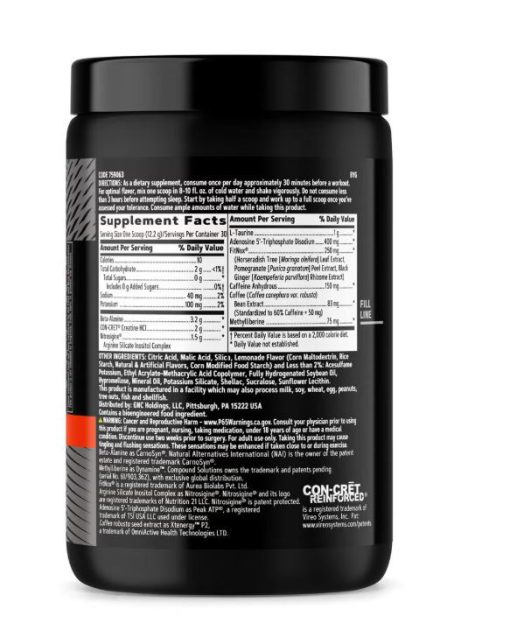 فرمولاسیون این محصول ترکیبی از کافئین سریعالاثر و کافئین آزادسازی پایدار (Xtenergy™)، کراتین HCL، بتا آلانین، PeakATP®، ترکیبات نیتریک اکساید مثل Nitrosigine® و ترکیبات استقامتی مانند FitNox® است. این مجموعه باعث میشود ورزشکاران هم انرژی سریع داشته باشند و هم در طول تمرین دچار افت توان نشوند.