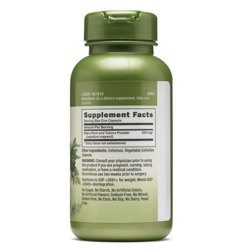 کپسول ماکا جی ان سی GNC MACA ROOT 525MG در بستهبندی ۱۰۰ عددی عرضه میشود و هر وعده مصرفی یک کپسول است. فرمولاسیون این مکمل بهطور کامل گیاهی بوده و هیچگونه گلوتن، سویا، لبنیات، گندم، نشاسته، قند ، مخمر یا افزودنیهای مصنوعی در آن وجود ندارد. کپسولها از سلولز گیاهی ساخته شدهاند و بلع آنها آسان است. برند GNC که از سال ۱۹۳۵ فعالیت دارد، تضمین میکند که این محصول با بالاترین استانداردهای کیفی و ایمنی تولید شده است.