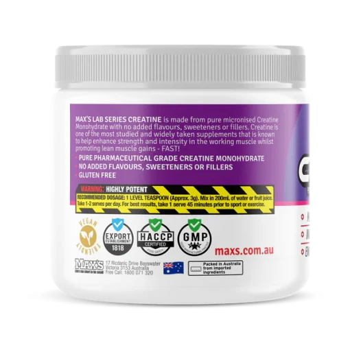 کراتین مونوهیدارت مکسس MAX’S CREATINE MONOHYDRATE از کراتین مونوهیدرات خالص میکرونیزه شده ساخته شده است که به طور گسترده مورد مطالعه قرار گرفته است. طبق بررسی های کراتین مونوهیدرات ایمن و موثر است. این شکل خالص کراتین به افزایش انرژی و قدرت برای دوره های شدید فعالیت بدنی کمک می کند و به افزایش عضلات بدون چربی کمک می کند.