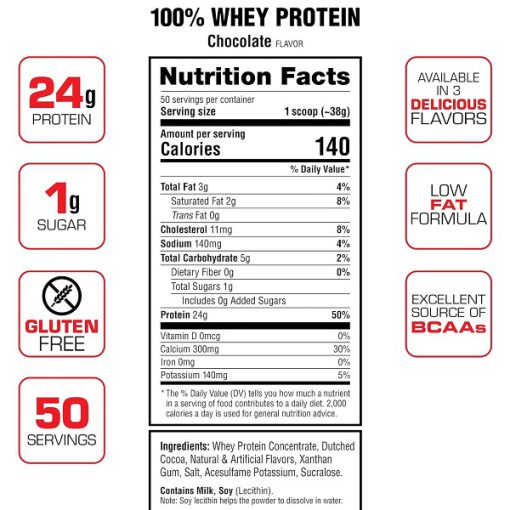 هر وعده 38 گرمی از این پروتئین حاوی 140 کالری، 24 گرم پروتئین، 3 گرم چربی، و 5 گرم کربوهیدرات است که نیازهای تغذیهای ورزشکاران و بدنسازان را به خوبی تأمین میکند. همچنین این محصول حاوی کلسیم و پتاسیم است که به حفظ سلامت استخوانها و عملکرد عضلات کمک میکند.