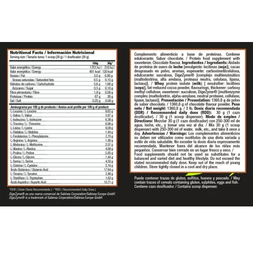 پروتئین وی ایزوله 96%، امولسیفایر: لسیتینها (سویا)، طعمدهندهها، غلیظکننده: کربوکسی متیل سلولز، شیرینکننده: سوکرالوز، DigeZyme®: شامل مالتودکسترین، آلفا آمیلاز، پروتئاز خنثی، سلولاز، لیپاز و لاکتاز