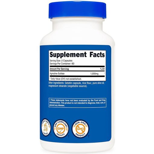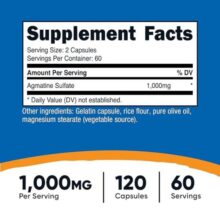 سولفات آگماتین نوتری کاست حاوی 500 میلیگرم آگماتین در هر کپسول است و هر بطری شامل 120 کپسول (60 وعده) میباشد. این محصول تحت استانداردهای بالای تولید قرار دارد و در تسهیلات ثبت شده FDA مطابق با GMP (روشهای خوب تولید) ساخته میشود.