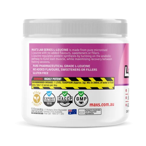 MAX’S L-Leucine حاوی تنها L-Leucine خالص است و هیچ افزودنی، پرکننده یا ماده binders ندارد. این به معنای یک محصول خالص و مؤثر است که میتوانید به کیفیت آن اعتماد کنید.