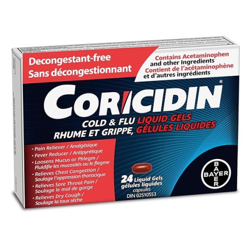 تسکین دهنده سرماخوردگی و آنفولانزا کوریدیسین Coricidin Decongestant Free Cough and Cold Medicine تسکین سریع و موثر علائم سرماخوردگی و آنفولانزا را ارائه می دهد. کوریسیدین علائم آزاردهنده سرماخوردگی و آنفولانزا مانند سرفه خشک، احتقان قفسه سینه، سردرد و درد جزئی، گلودرد و تب را تسکین می دهد. کوریسیدین بدون ضد احتقان است. هر کپسول Coricidin Cold & Flu حاوی 325 میلی گرم استامینوفن برای کمک به تسکین درد و کاهش تب، 10 میلی گرم دکسترومتورفان هیدروبروماید برای سرکوب سرفه و 200 میلی گرم خلط آور Guaifenesin برای تسکین احتقان قفسه سینه و شل شدن خلط و مخاط است. این ضد درد در کپسول های سافت ژل مایع غلیظ عرضه می شود.