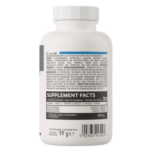 یک سروینگ، 3000 میلی گرم دی اسپارتیک اسید را تامین می کند و این مکمل حاوی 30 سروینگ است که برای یک ماه مکمل منظم کافی است. D.A.A یا دی اسپارتیک اسید یک ترکیب شیمیایی آلی از گروه اسیدهای آمینه پروتئین درون زا است که در بدن انسان عمدتاً در غده هیپوفیز و هیپوتالاموس تولید می شود.