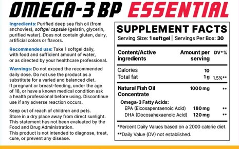 امگا 3 بی پی اسنشیال بالکان فارما حاوی 1000 میلی گرمروغن ماهی امگا 3 در هر کپسول است.