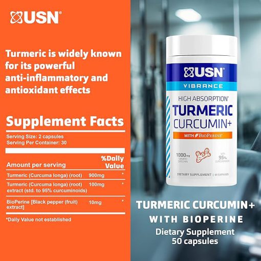 کورکومین زردچوبه یو اس ان حاوی 95 کورکومینوئید با عصاره فلفل سیاه بیوپرین جذب پیشرفته برای سلامت قلب و عروق و حمایت از مفاصل است.